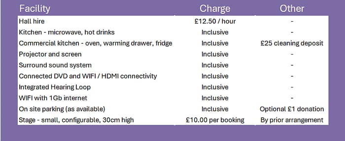 This is a summary of the hire rates and terms for quick reference but the hirer must familiarise themselves with the full Terms and Conditions when hiring the hall.