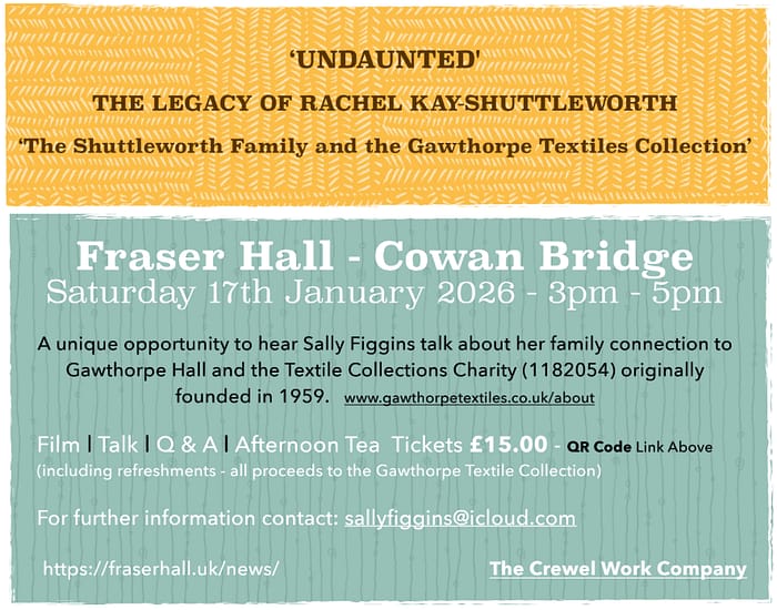 We are very pleased to invite and welcome Sally to talk about her family connections to Gawthorpe Hall and the Textile Collections Charity. Please join us for the talk, film and afternoon tea.
